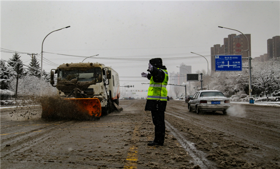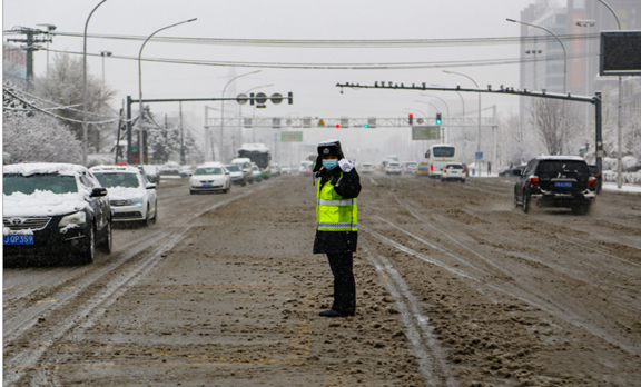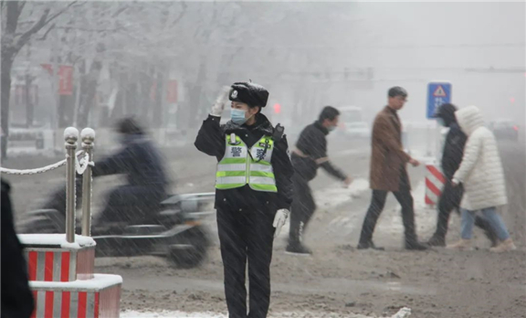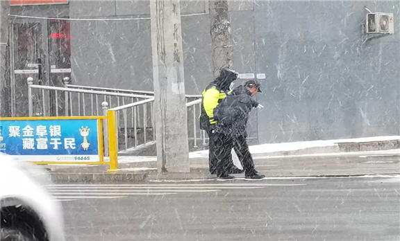 3 月 14日早,阜新降小到中雪。阜新市公安局交警支队民警和警辅人员坚守路面执勤,全力保障道路畅通和群众出行安全。
