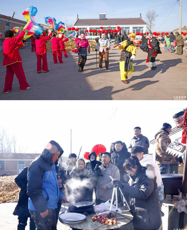 滑冰车、打陀螺、冰钓等一系列冰雪运动沸腾了雪村;杀年猪、灌血肠、包豆包、沙土炒苞米花让人垂涎欲滴;剪窗花、沾糖葫芦、玩嘎拉哈等民俗活动年味十足;还有高跷、秧歌、蒙汉民族联谊歌舞让人大饱眼福……村民们用美食、美景和欢歌笑语喜迎春节的到来。欢乐祥和的场面和独特的民俗文化引来中央广播电视总台的记者团队,在腊八节当天下午进行了37 分钟的现场直播。