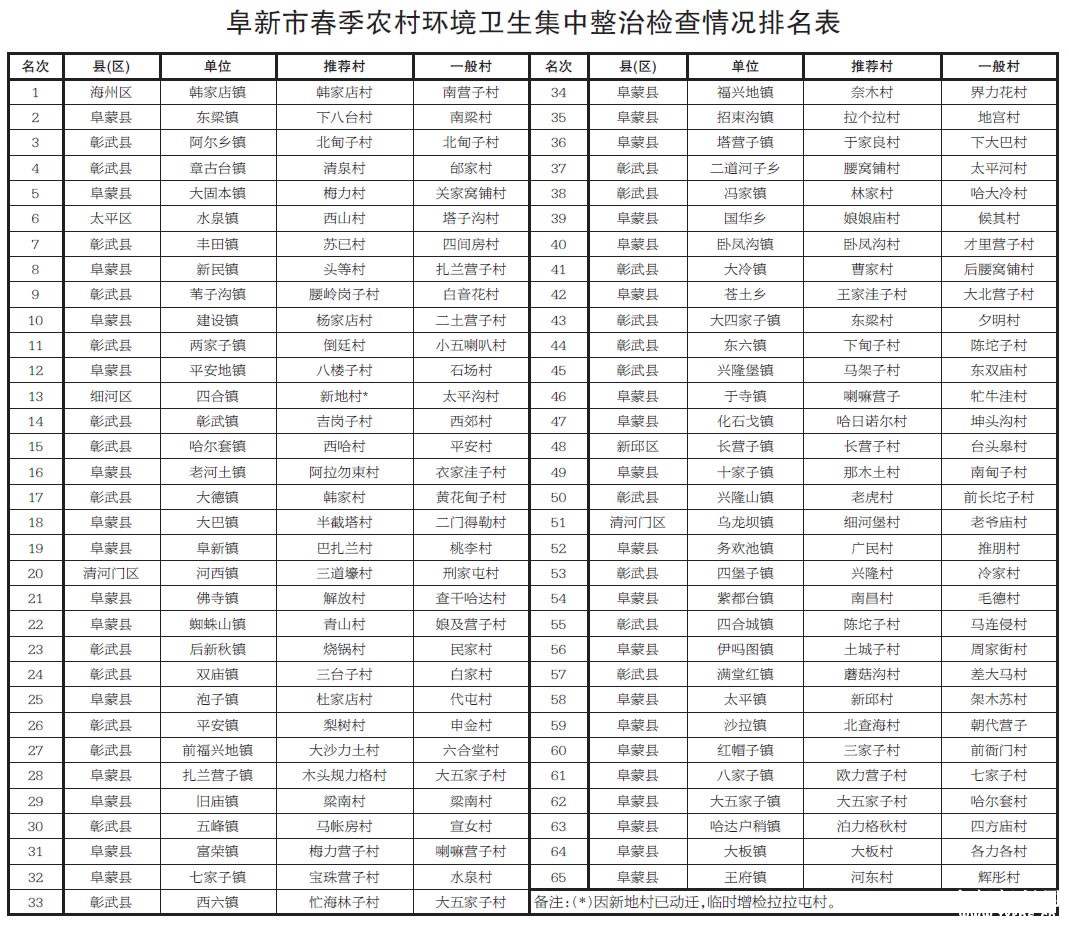 按照《阜新市委农村工作领导小组办公室关于开展春季农村环境卫生集中整治行动的通知》(阜农领办[2019]8号)和《关于开展2019年阜新市春季农村环境卫生集中整治工作验收的函》的精神,市住建局联合市农业农村局于5月29日至6月13日,派出2 个检查组,利用11 个工作日,对全市涉农县区所有乡镇的春季农村环境卫生集中整治行动完成情况进行了检查验收,此次验收共抽查65 个乡镇的131 个行政村(含1 个动迁村),现将各乡镇排名情况通报如下。