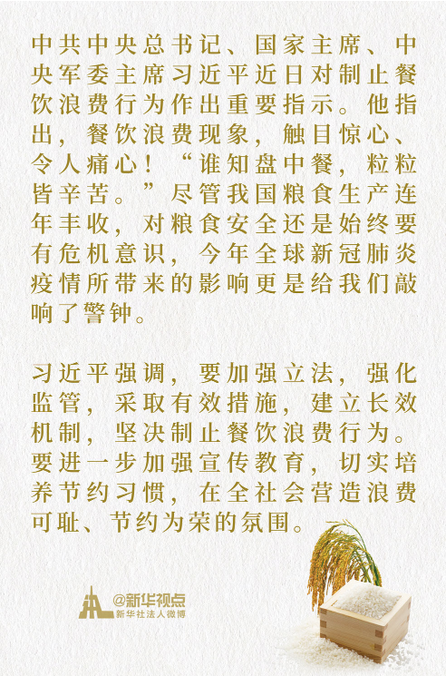 习近平总书记在指示中强调:“今年全球新冠肺炎疫情所带来的影响更是给我们敲响了警钟。”这一特殊背景下,节约粮食,不仅仅是风尚和美德问题,更关乎人民生活幸福和国家长治久安。
