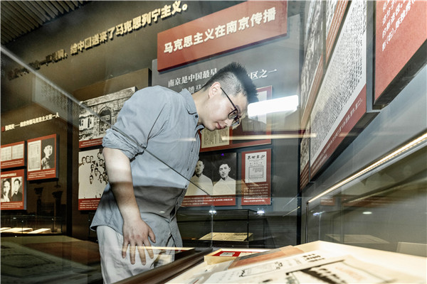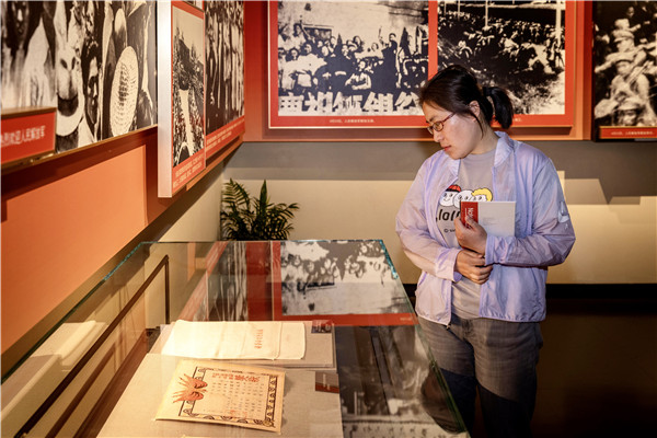 “红帆港青年学习社”的社员们,在军大衣、绑腿、文件包等渡江战役时期的文物前驻足观看,用心体会渡江战役中发生的振奋人心的革命故事。