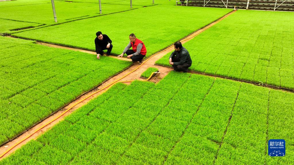 4月11日,在常宁市兰江乡兰江村早稻工厂化育秧基地,科技特派员和村民在查看秧苗长势情况(无人机照片)。