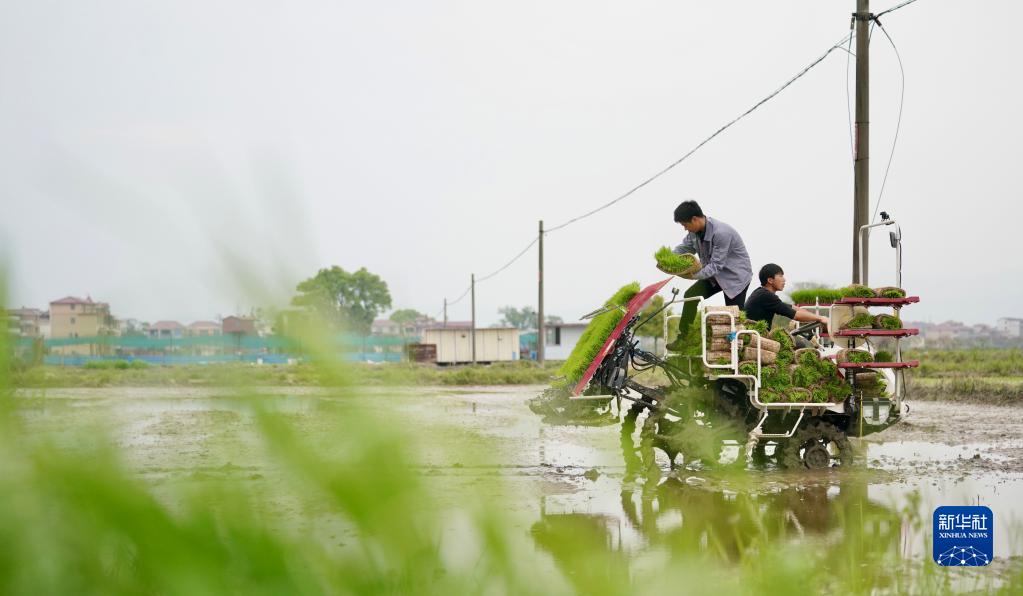 4月10日,黄从明(左)在插秧机上和同事一起插秧。