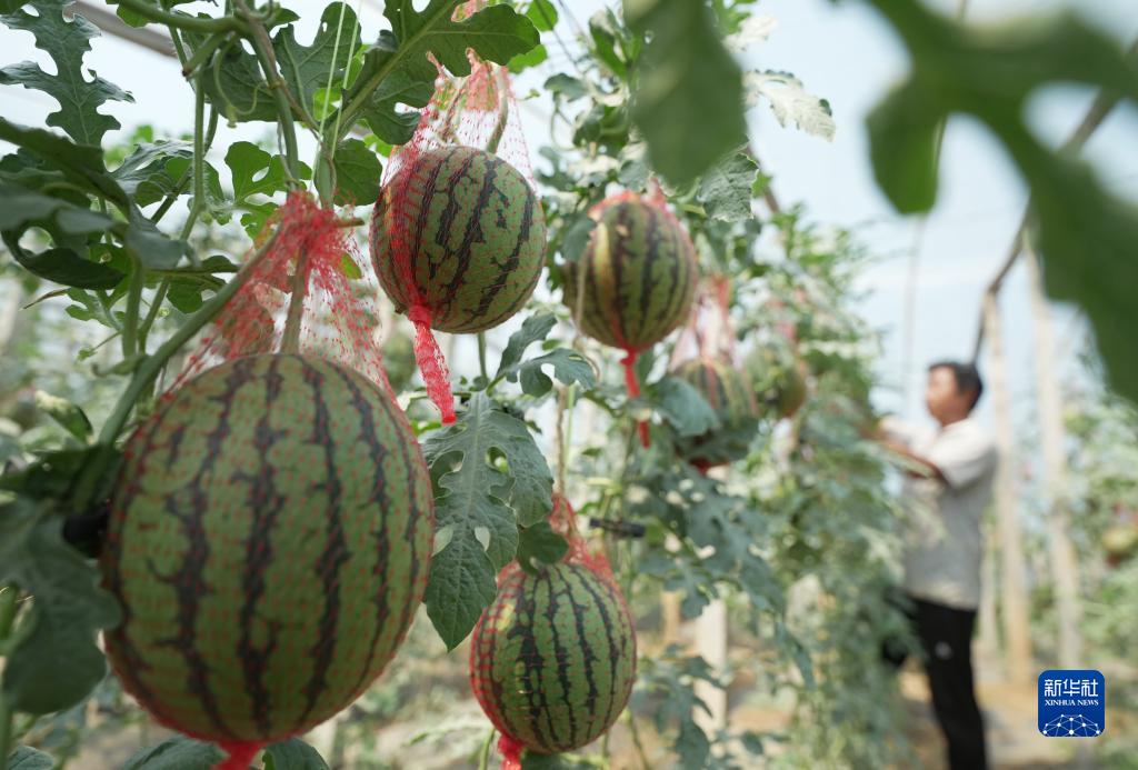 6月5日,卢龙县木井镇一家西瓜种植合作社的社员在大棚内管护西瓜。