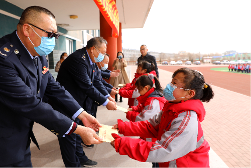 捐赠仪式最后,王府分局真诚邀请4名学生担任义务宣传员,将“税收”这颗种子从小种在心里,随着成长,长成参天大树,将来为国家、为社会做出贡献。